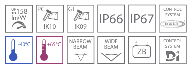 Lyskasteren er som standard tilpasset drift med sentralbatteri (ZB), og er i DA-versjon utstyrt med strømforsyning som støtter DALI-2- og D4i-protokoll.