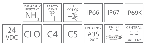 Armaturen er også utstyrt med spesialoptikk som gir optimal lysfordeling. Som tilvalg kan armaturen leveres med 3-timers nødstrømsmodul A3S, tilpasset forsyning fra sentralbatteri (ZB), driver med DALI-2-grensesnitt (DA), eller med funksjon for konstant lysutbytte (CLO).